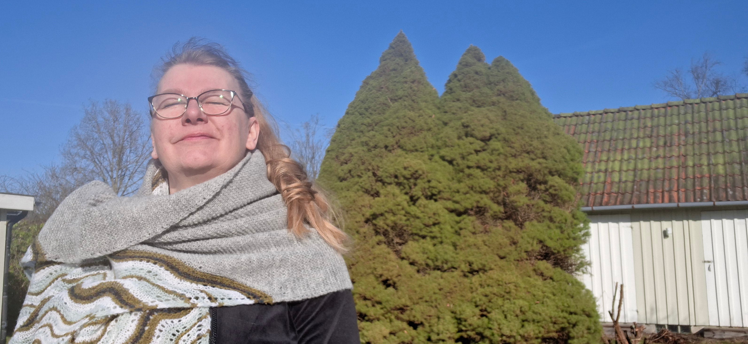 HjemmeDeens / Faroese for "home". The Faroese shawls have a centre panel with separate patterns. Usually in a fuller yarn, but here in fine Handspun. Also handdyed (Hilltopcloud).