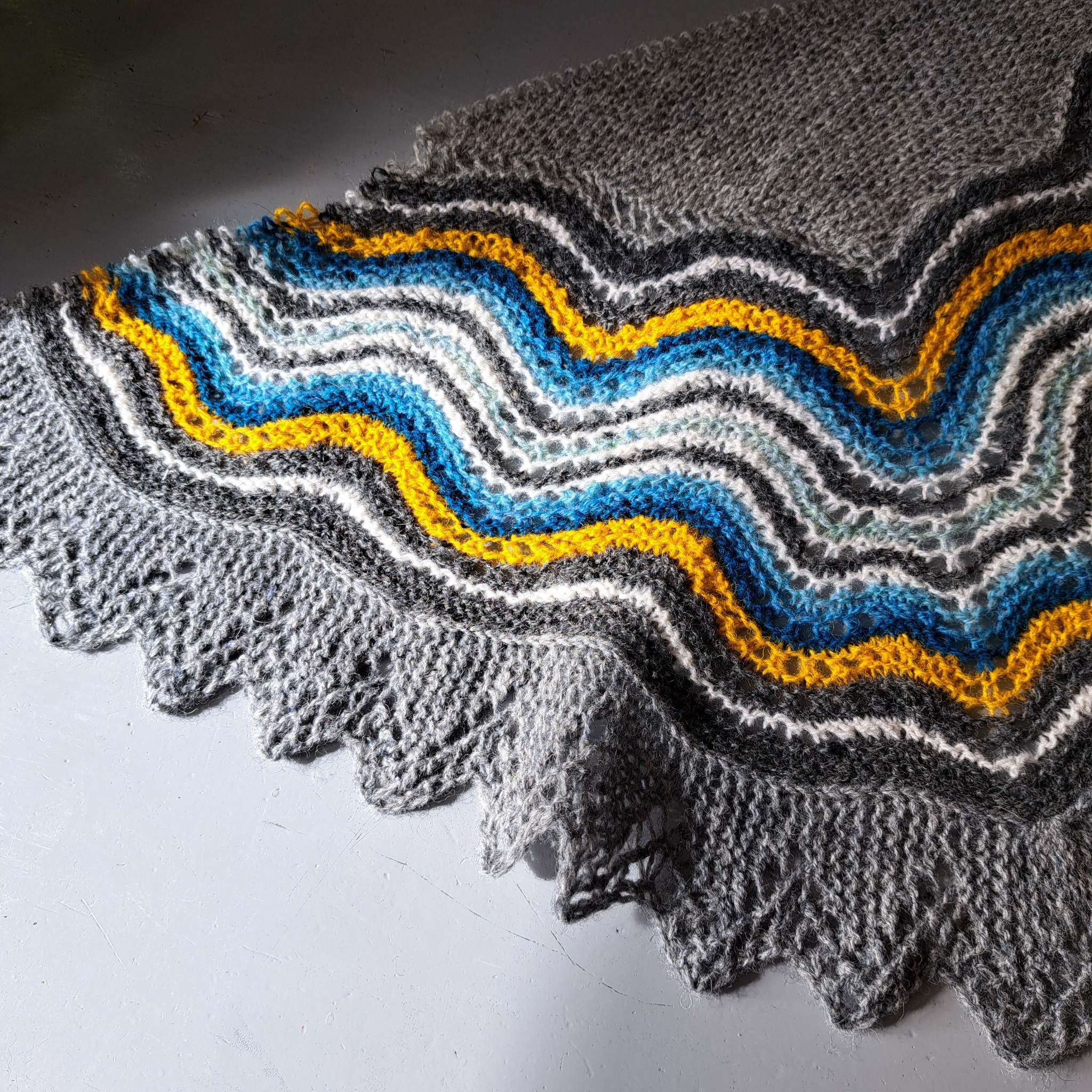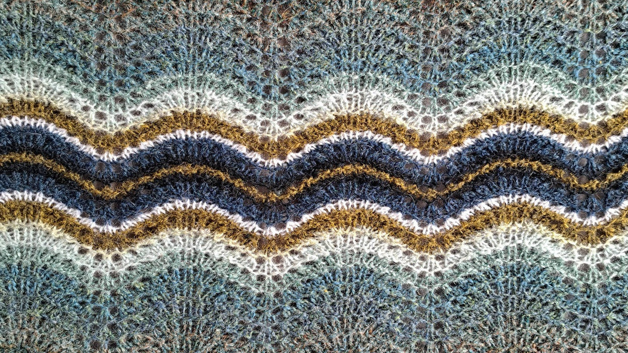 LundThis is a delicate lace Hap. Construction is still the same, but the border is very wide, with nice details in the white stripes.